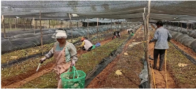 在這充滿希望的季節(jié)里,鶴慶縣六合鄉(xiāng)松坪村羊肚菌種植基地一壟壟羊肚菌破土而出,頭戴獨特的褐色“網(wǎng)格帽”,在陽光下閃爍著光芒,為松坪村繪就一幅生機勃勃的致富畫卷。